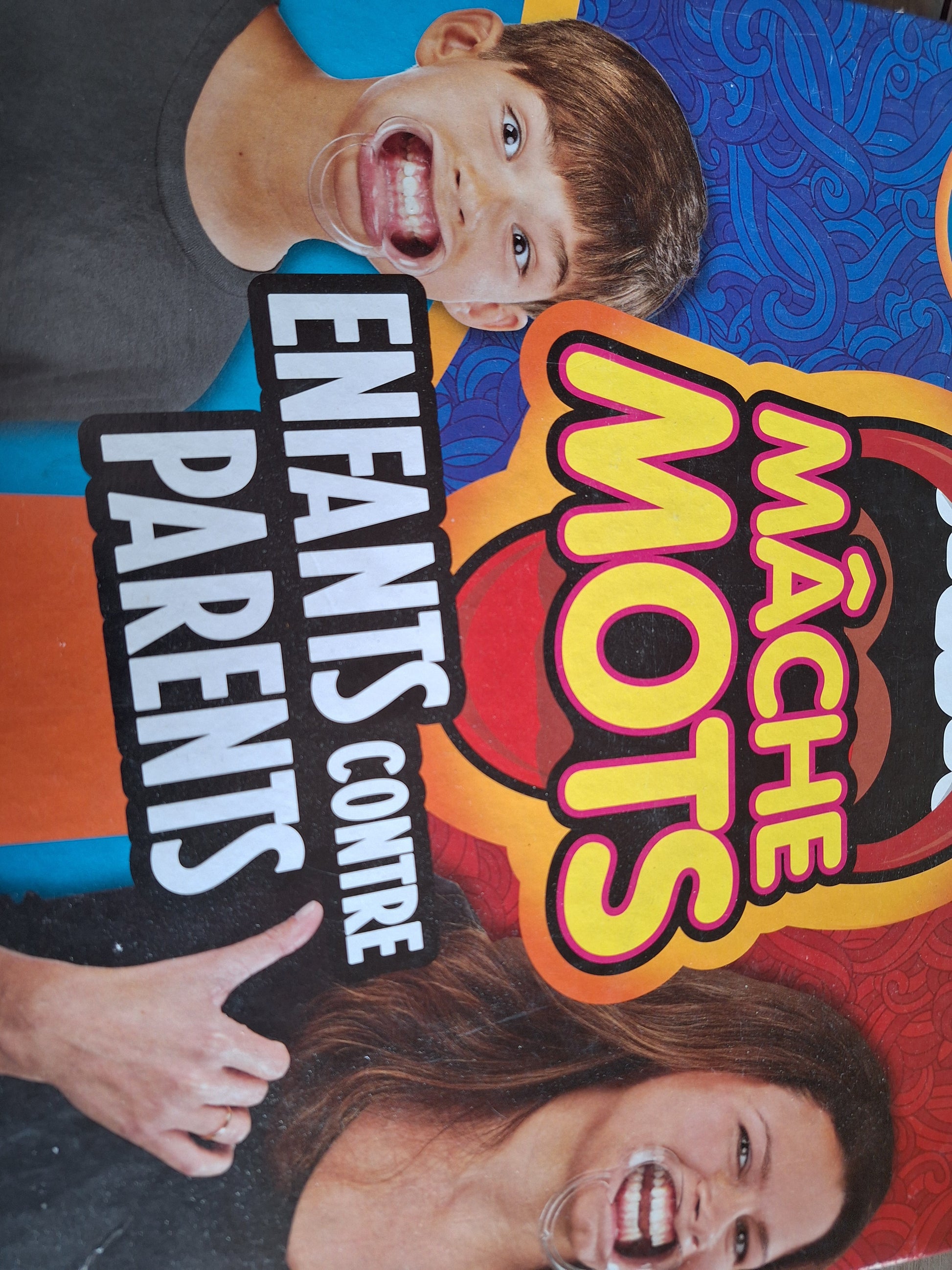 - ACCESSOIRES INCLUS : Contient 6 mâche-mots pour enfants, 4 pour adultes, 200 cartes recto-verso (100 pour enfants, 100 pour parents), un sablier, et les règles fu jeu en français